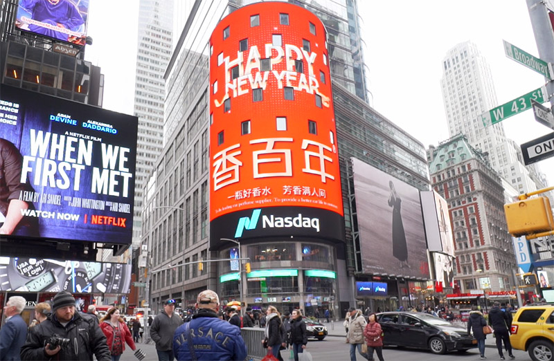 香百年作為民族品牌香薰,多年來一直受到大家的支持與關注,借著此次舉國騰歡的春節(jié),通過納斯達克戶外大屏這個窗口,向全世界人民拜年賀春,祝福各國的朋友們新年快樂,祝愿你們在2018年都有一個嶄新的開始。