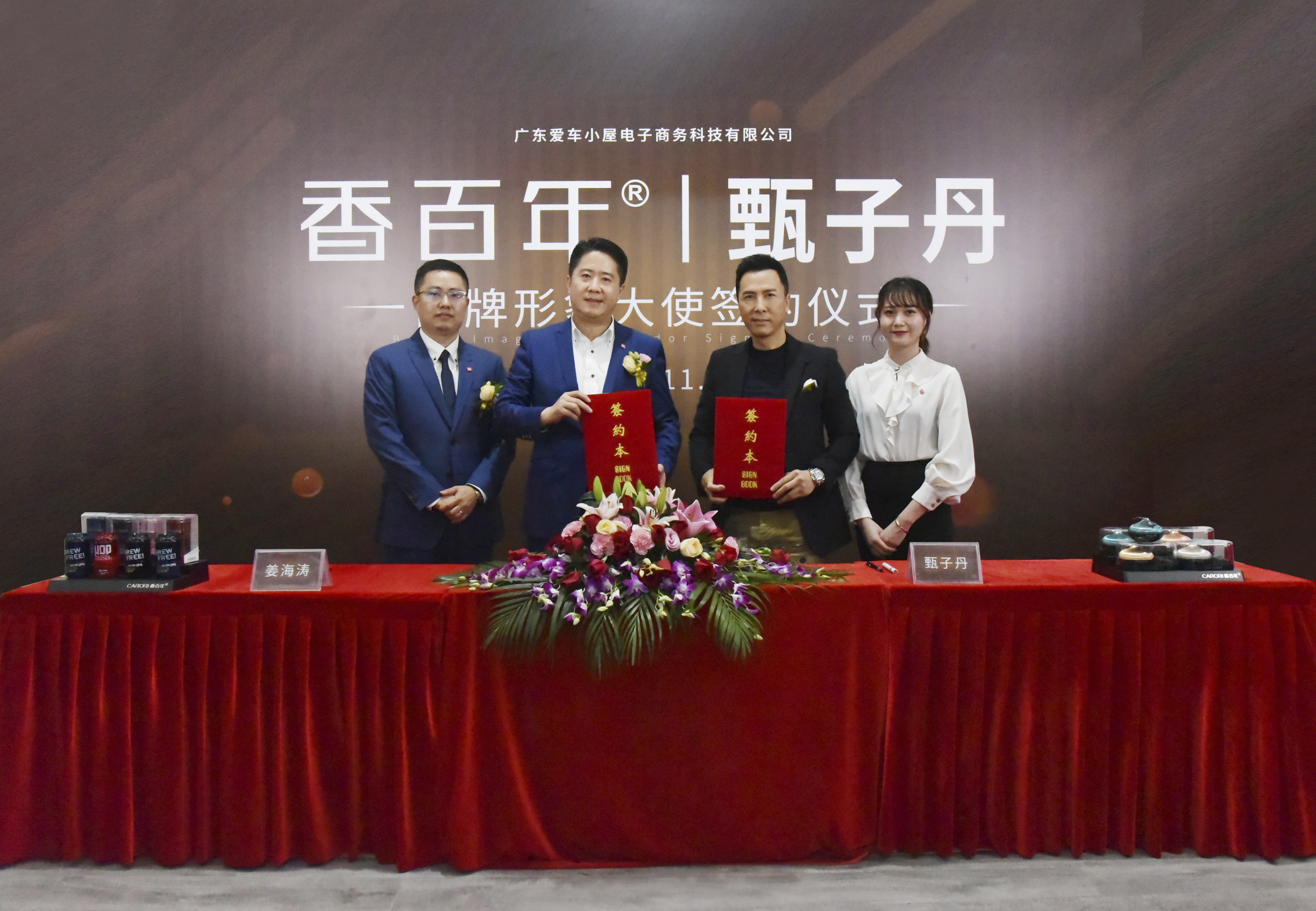 廣東愛車小屋電子商務科技有限公司董事長姜海濤先生、總經理肖崇豪先生及公司高管在簽約儀式上共同見證了國際著名動作巨星甄子丹先生成為香百年品牌形象大使的重要時刻,并合影留念。